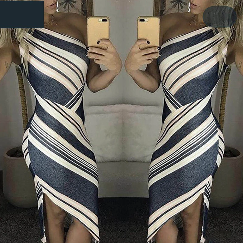 2020 Summer New Fashion Women Skew Neck Office Asymmetrical Elegant Party Dress Striped One Shoulder Irregular Bodycon Dress